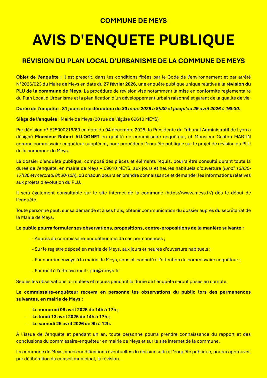 Durée de l'enquête : 31 jours et se déroulera du 30 mars 2026 à 8h30 et jusqu'au 29 avril 2026 16h30.